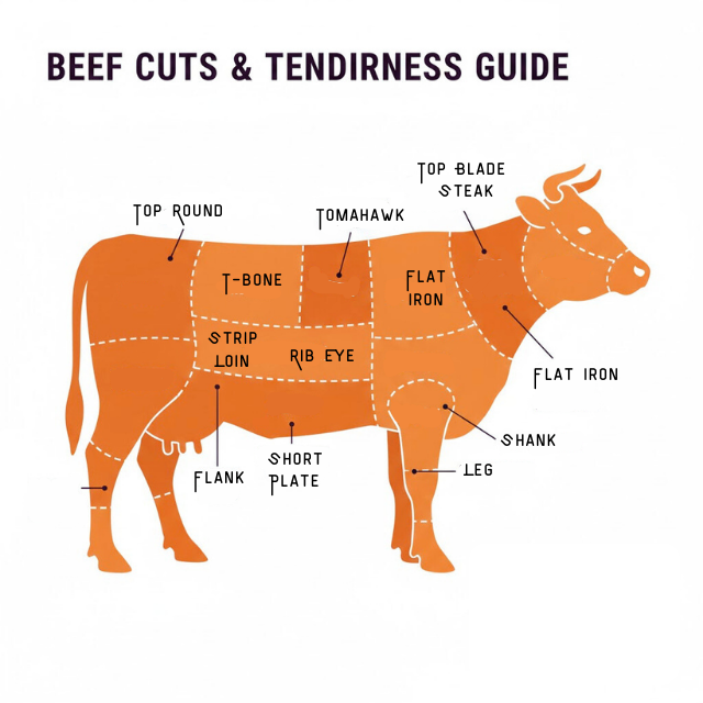 ส่วนที่นุ่มที่สุด (Tender Cuts): เช่น สันใน (Tenderloin) และ สันนอก (Striploin) เป็นส่วนที่กล้ามเนื้อใช้งานน้อย จึงมีความนุ่มสูง เหมาะกับการทำสเต็กหรือย่างโดยใช้ความร้อนสูงในเวลาสั้นๆ